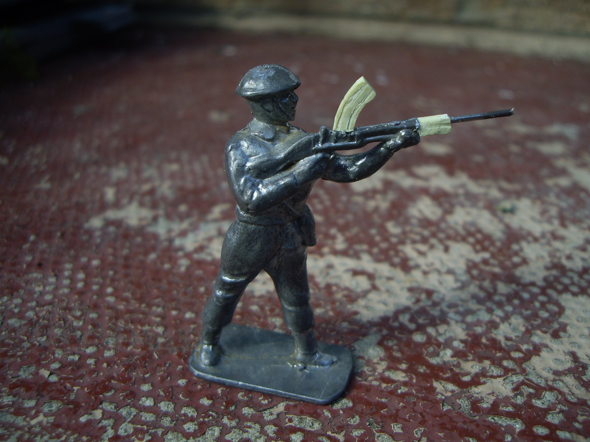 I'm not too sure what make these figures are, but they have been around sometime. I picked them up for what was just about an acceptable price, £14.50 delivered. OK, some needed firearm repair work, and I was going to have to paint strip them if I wanted my collection to have something more appropriately khaki. But I think its a nice collection, and includes an officer. (There was also three WW1 British and a single WW2 American making up the sixteen figures.)